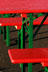 A red summer party table with green legs is set up in a sunny backyard, ready for festivities to begin. It's quiet now, but soon this table will hold food, cutlery, glasses, and plates as the backyard fills with the sounds of partygoers.